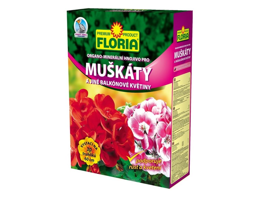 Floria kryštalické hnojivo pre muškáty a iné balkónové kvety je 100% vodorozpustné hnojivo určené na muškáty, petúnie, lobelky, fuchsie a ďalšie balkónové kvety, ktoré vyžadujú vysoké dávky rýchlo prijateľných živín. Hnojivo obsahuje fosfor, ktorý zaistí bohaté kvitnutie a dusík urýchľuje tvorbu zelenej hmoty. Obsiahnuté mikroprvky podporujú správny rast a vývoj rastlín. Správnym používaním tohto hnojiva docielime zdravých a zelených listu a bohatého kvitnutia.