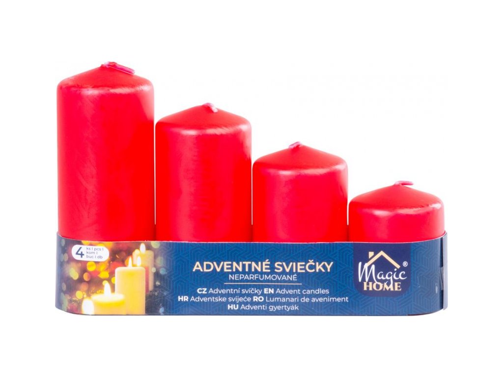 Adventné sviečky MagicHome skvele dotvoria čarovnú atmosféru Vianoc u Vás doma. Perfektne sa hodia na dotvorenie do advetných vencov či dekorácií. 4 rôzne výšky - 4,8x6 cm - váha vosku 85g, 4,8x8 cm - váha vosku 110 g, 4,8x10 cm - váha vosku 140 g, 4,8x12 cm - váha vosku 170 g. Farba: červená.
